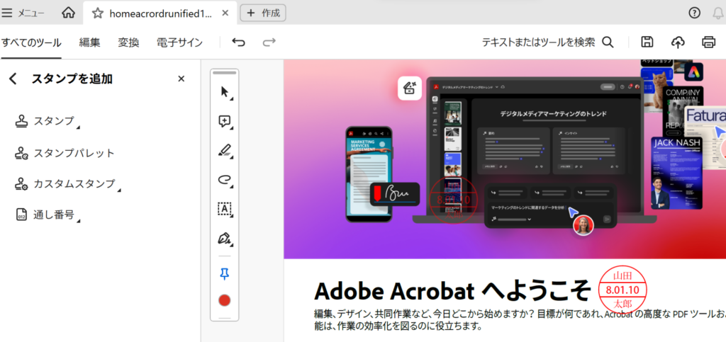 「すべてのツール」-「スタンプを追加」から「スタンプ」-「電子印鑑」で使いたい形式を選ぶ。